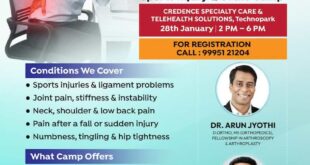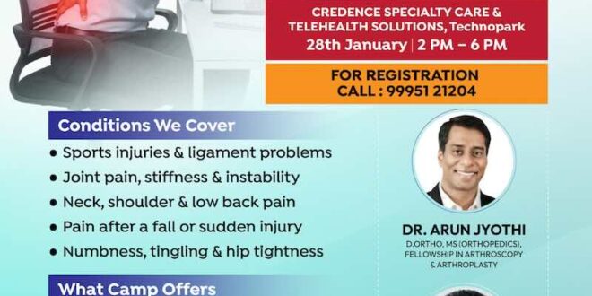 Technopark January 2026: Credence Hospital, in association with Prathidhwani—the welfare organisation of IT employees—will organise a Sports Injury & Orthopaedic Camp at Technopark on January 28, from 2 pm to …