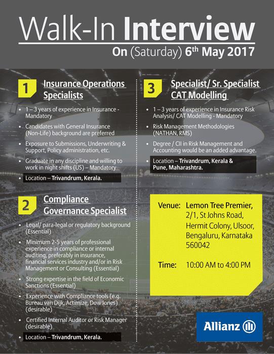 Allianz India walk-in interviews at Trivandrum and Bengaluru on May 6 (Saturday)