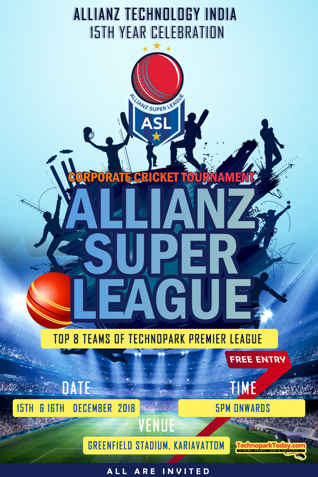 TechnoparkToday.com>> As part of the 15th year celebrations, Allianz Technology India is organizing a corporate cricket tournament – Allianz Super League (ASL). The tournament will feature matches between top 8 teams of last year’s Technopark Premier League, the annual cricket tournament of Technopark. The tournament will be held on December 15 to 16, 2018 at Greenfield Stadium Kariavattom at 5 pm.