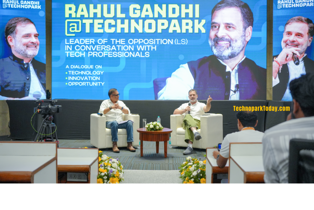 Technopark Trivandrum>> Congress leader Rahul Gandhi on Saturday called for stronger skills development and a renewed focus on manufacturing while interacting with technocrats, startup founders, and entrepreneurs during a dialogue on “Technology, Innovation and Opportunity” held at Technopark.