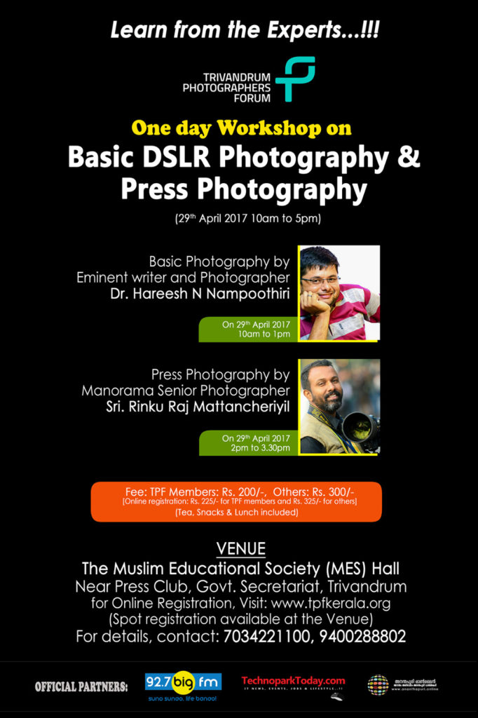TechnoparkToday.com>> Trivandrum photographers forum in association with TechnoparkToday.com is organizing a one day work shop on Basic DSLR photography and Press photography. The workshop will be held on April 29th, 10 pm to 5 pm at The Muslim Educational Society (MES) hall, near press club Trivandrum (near Gvt. Secretariat).