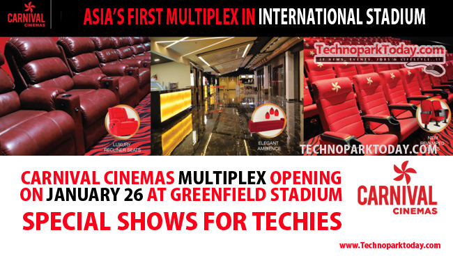 TechnoparkToday.com>> Carnival Cinemas will open the new 5-screen multiplex at Greenfield stadium on January 26, 2018. Among these, the fifth one will be a luxury screen. The launch will be with the screening of movies Padmaavat and Aadhi.
