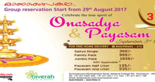 TechnoparkToday.com>> Celebrate this Onam with traditional Onam Sadya with mouth-watering payasams at Biverah Hotel and Suites, Kumarapuram. Biverah offers the delicious and magical treat of traditional tastes, Onasadya and variety of Payasams from September 3 to 6, 2017. Group reservations start from August 29. Free Home Delivery also available. Delivery available for Sadya Single, Family pack, and Jumbo pack. For More …