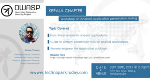 TechnoparkToday.com>> OWASP, Kerala Chapter is organizing Workshop on Android application penetration testing on 8th September 2017 at 2:30PM at Central Computing Facility (CCF), IIITM-K, Technopark, Trivandrum. Online registration started required but is free for anyone interested. Being the operating system with the largest user base, the threat landscape for Android applications cannot be ignored. While Android OS is being used on a wide variety of …