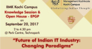 Technoparktoday.com> EPGP IIMK Kochi Campus is organizing a knowledge Session and Open House at park center here at Technopark Trivandrum on September 20 at 2 – 4:30PM. The Open house session will provide a brief introduction about the programme, the pedagogy, expectations from participants, commitments required and interaction with EPGP Participants. It will also help you to get additional information, …