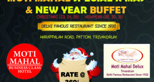 TechnoparkToday.com>> Moti Mahal (Delhi Famous Restaurant Since 1920), offers a special buffet for this festive season. Christmas and New Year special buffet at Rs. 369. The Christmas special buffet will be held on December 23 to 25 and New Year eve special buffet will be from December 29 to 31. A wide variety of soups, salads, breads, veg and non-veg …