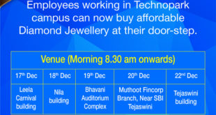 TechnoparkToday.Com>> Ever wished to gift some a diamond jewellery or buy one for yourself? It is not something you have to wait till you save some extra money. Muthoot Fincorp is offering a platform for employees in Technopark to buy affordable diamond jewellery at the campus. Muthoot Swarnavarsham and Divine Solitaires are setting up venues from 8.30 am at Leela …