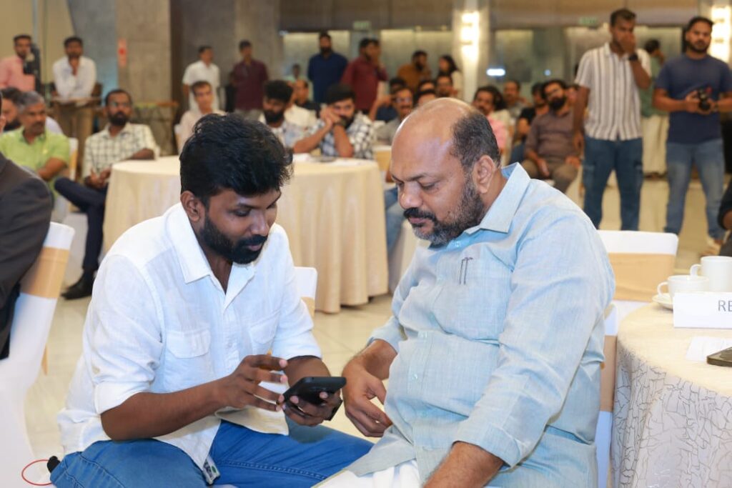 Minister for Law, Industries and Coir Shri P. Rajeeve taking a look at the Santa Calling AI app during the startup conclave held in Thiruvananthapuram. Shri Richin R Chandran, CEO, Richinnovations Technologies, is also seen.