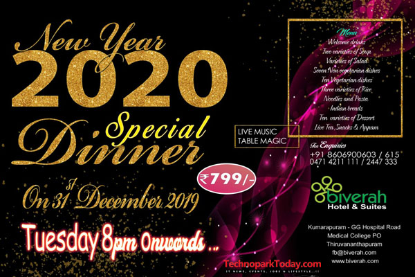 TechnoparkToday.com>> Biverah Hotel and suites, one of the best business class hotels in Trivandrum, announced 2020 New Year Special Dinner on 31st December 2019.