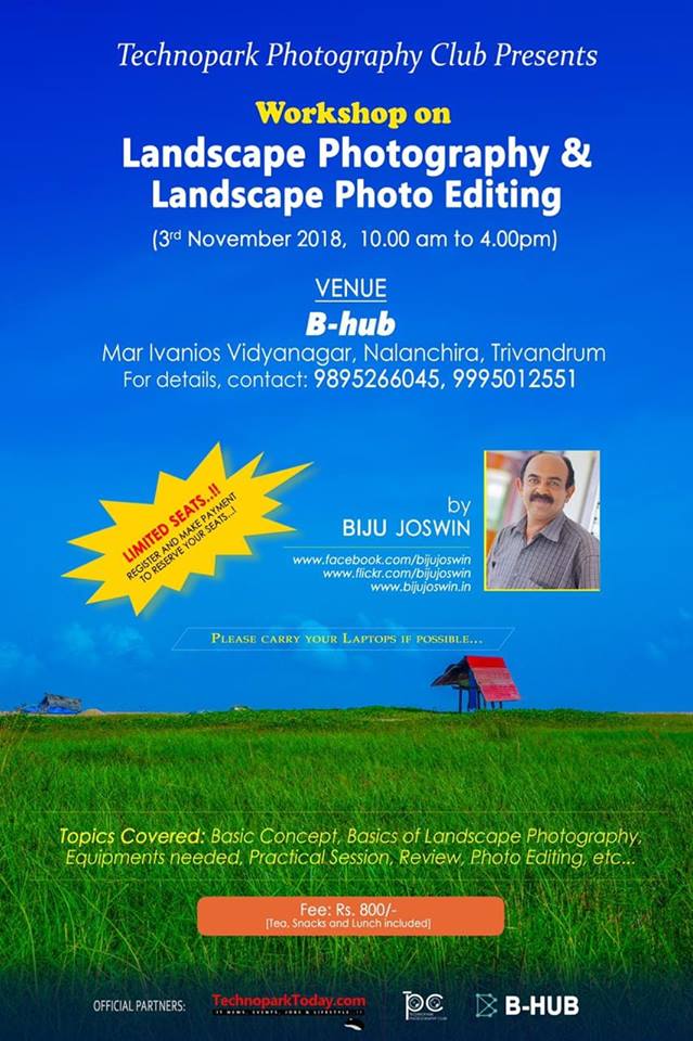 TechnoparkToday.com>> Technopark Photography Club (TPC), a collective of techie photographers in association with TechnoparkToday.com, is organizing a photography workshop at B-Hub, Mar Ivanios College on November 3, 2018 (Saturday, 10 am to 5 pm). The workshop will cover landscape photography and landscape photography editing techniques. Renowned landscape photographer, Biju Joswin will lead this practical-oriented workshop, which will help to sharpen photography and photo editing skills to next level. The workshop is open for public. This is the second edition of photography workshop series by TPC.