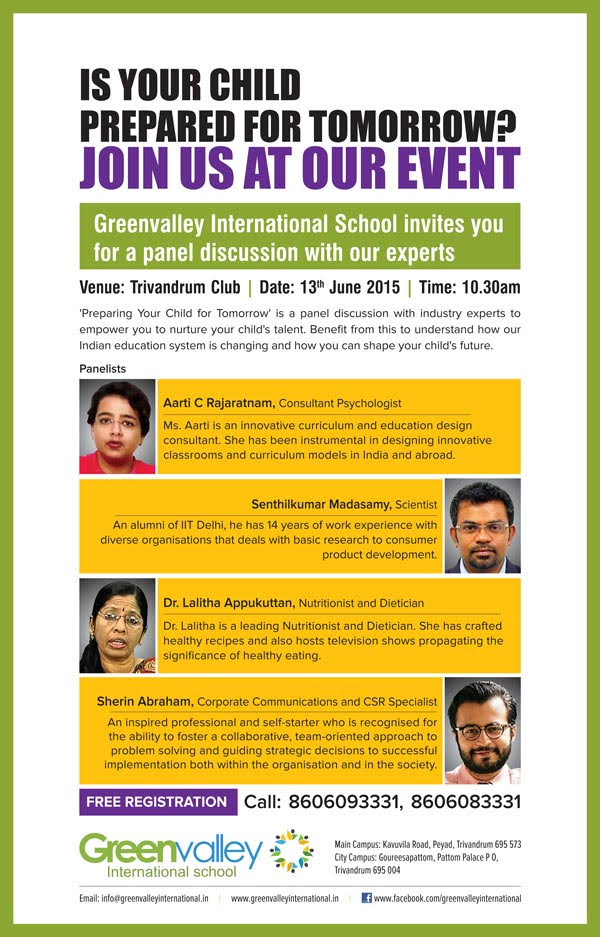 TechnoparkToday.com(June, 2015): Greenvalley International School hosts awareness event and panel discussion titled ‘Preparing your Child for Tomorrow’ at Trivandrum Club on Saturday, June 13, 2015.As schools and colleges across India gear up for the new Education policy to be announced later this year, there are several indicators of the changes to come. In a first of its kind initiative aimed to inform parents about the sweeping changes in India’s education scenario, Greenvalley International School will host an awareness event and panel discussion themed around ‘Preparing your Child for Tomorrow’ from 10:30 am to 12 noon on Trivandrum Club on June 13, 2015.