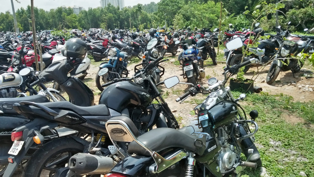 The parking lot dedicated for two wheelers in front of Ganga building does not have the capacity to hold even half of the bikes coming in to the building on daily basis. The parking now spreads out of the interlocked base area to the ground nearby. However, parking bikes on this rough ground is not easy and when techies come back to take the bikes, they will see vehicles fallen on ground and some time the mirrors broken.