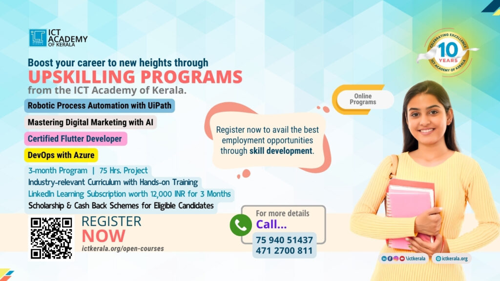 At the ICT Academy of Kerala (ICTAK), we recognize the transformative power of industry-centric upskilling programs. Our offerings are tailored to equip learners with cutting-edge skills that are in high demand across various industries. Whether you choose to delve into mastering Digital Marketing with AI, mastering Robotic Process Automation (RPA) with UiPath, diving into DevOps with Azure, or becoming a Certified Flutter Developer, each program promises a comprehensive learning experience designed to prepare you thoroughly for today’s competitive job market.