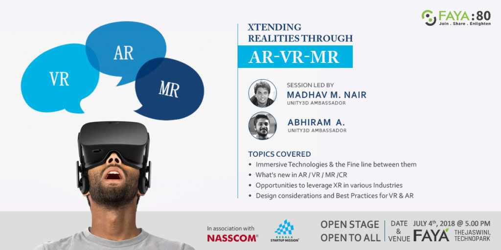 The 62nd edition of FAYA:80 Trivandrum, Xtending Realities through AR-VR-MR, will be an opportunity for all application developers, testers, technical managers and other technology enthusiasts to take their first steps into the fascinating and exciting world of Extended Reality (XR) in all its forms.